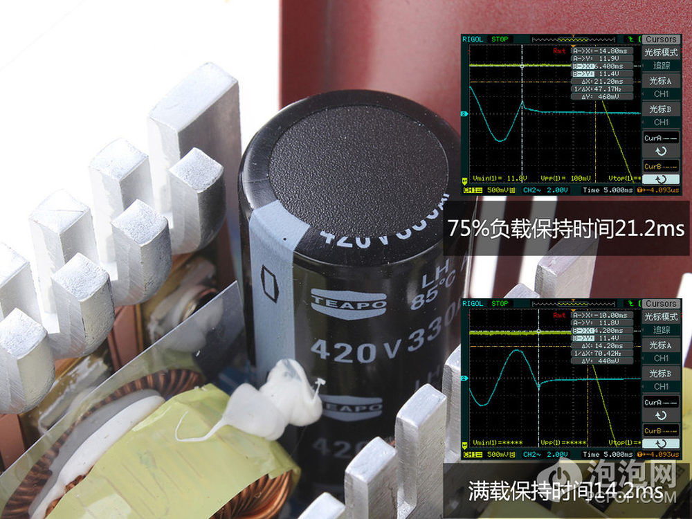 在75%%负载下保持时间如果可以过16ms才算合格,这颗电源已经超过合格线一大截了,主电容330uF,420V耐压,785℃耐温,Teapo台系一线厂出品。11/22