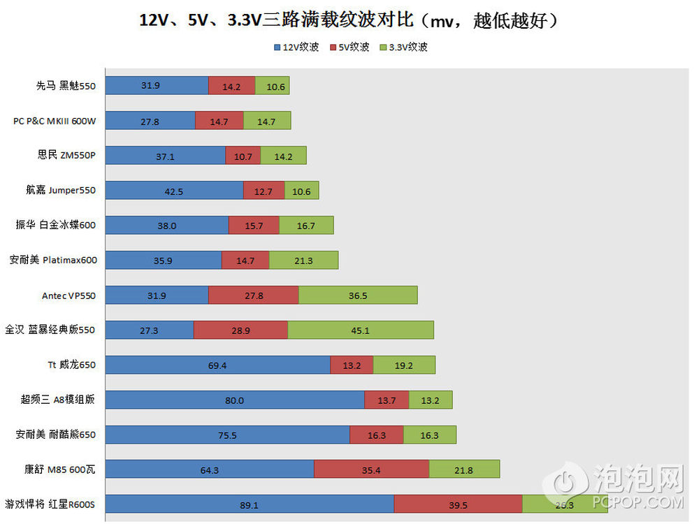 纹波抑制上没有像其他电源那样故意压低,虽然都在合格线之内,还是没有敌过众多高价电源。14/22