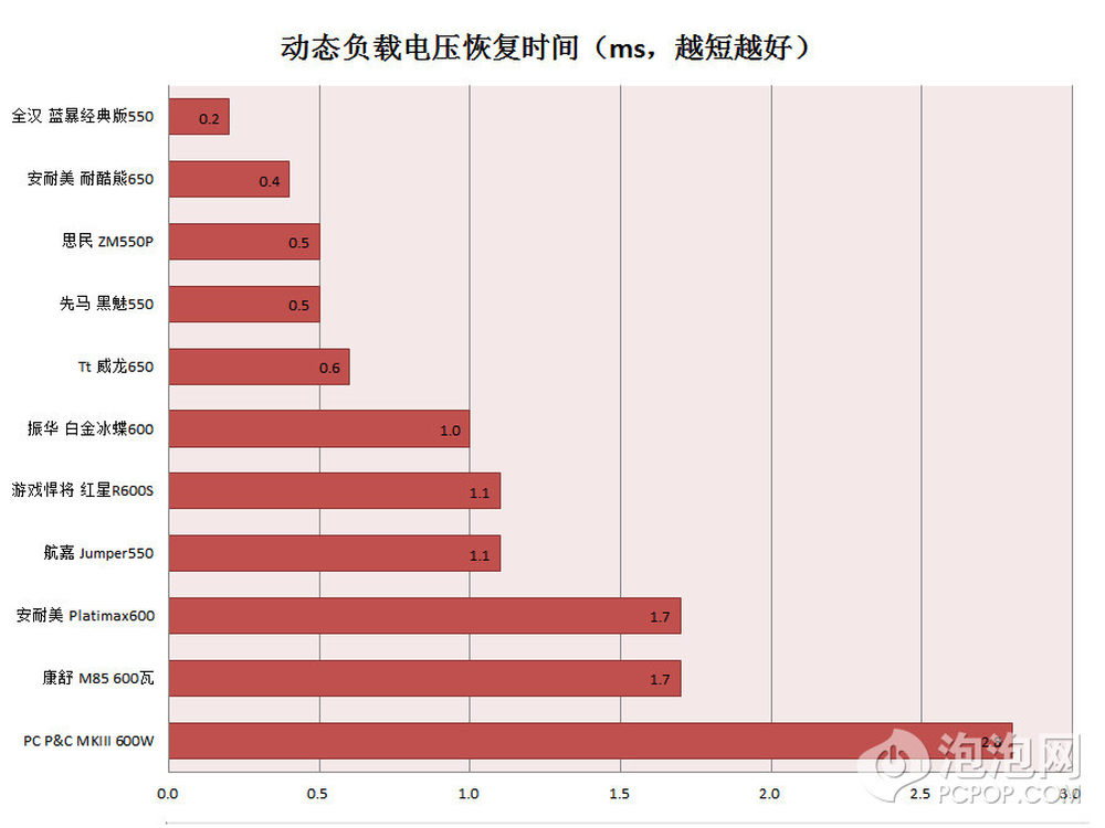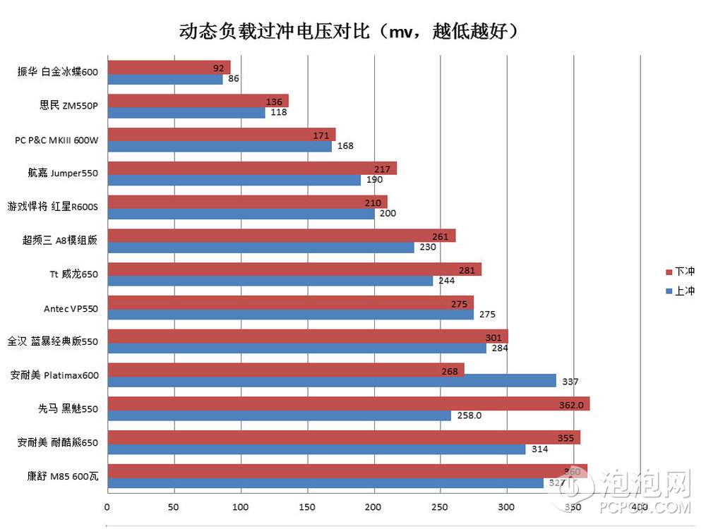 我们排列过冲电压的位次其实稍有不妥,因为这代表不了动态性能的稳定性,比如这里表现比红星R600S靠前一名的Jumper 550在某些动态频率上容易出现震荡。从之前红星R500S的表现看,这个系列电源的动态性能表现都不错。15/22