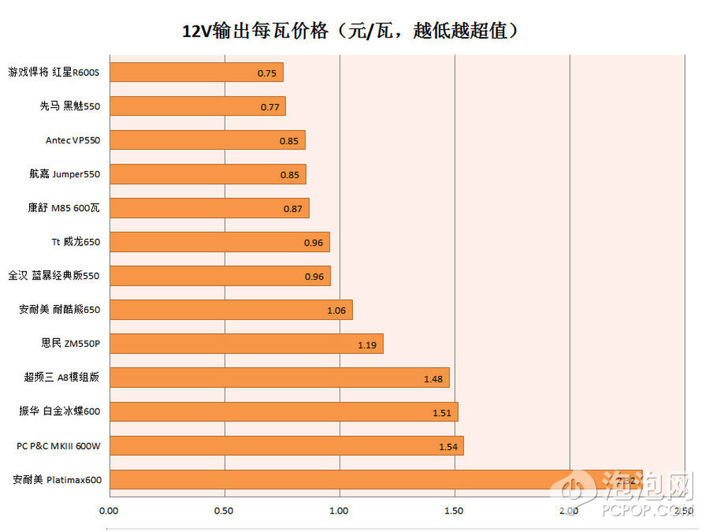 综合上面的性能排行,这颗电源有领先、有落后、也有排在中游的,总体应该处于性能中游,但12V输出每瓦价格却是最低的。