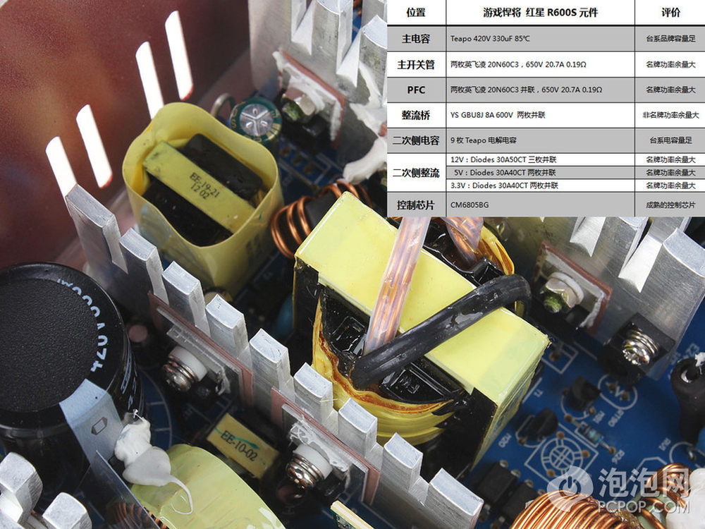 游戏悍将红星R600S电源采用了主动式PFC CM6805控制的双管正激开关 肖特基整流,其中3.3V单路磁放大,这个方案在之前我们见过的。18/22