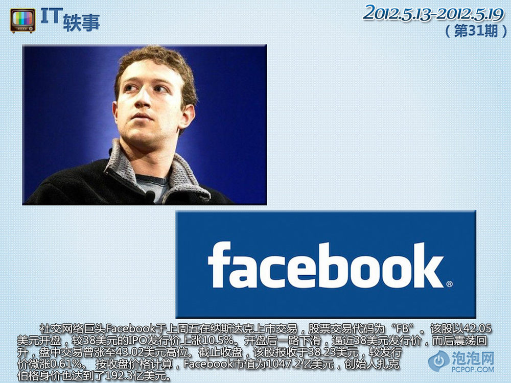 社交网络巨头Facebook于上周五在纳斯达克上市交易,股票交易代码为“FB”。该股以42.05美元开盘,较38美元的IPO发行价上涨10.5%%。开盘后一路下滑,逼近38美元发行价,而后震荡回升,盘中交易曾涨至43.02美元高位。截止收盘,该股报收于38.23美元,较发行价微涨0.61%%。 按收盘价格计算,Facebook市值为1047.2亿美元,创始人扎克伯格身价也达到了192.3亿美元,一举成为世界最富有的80后。5/13