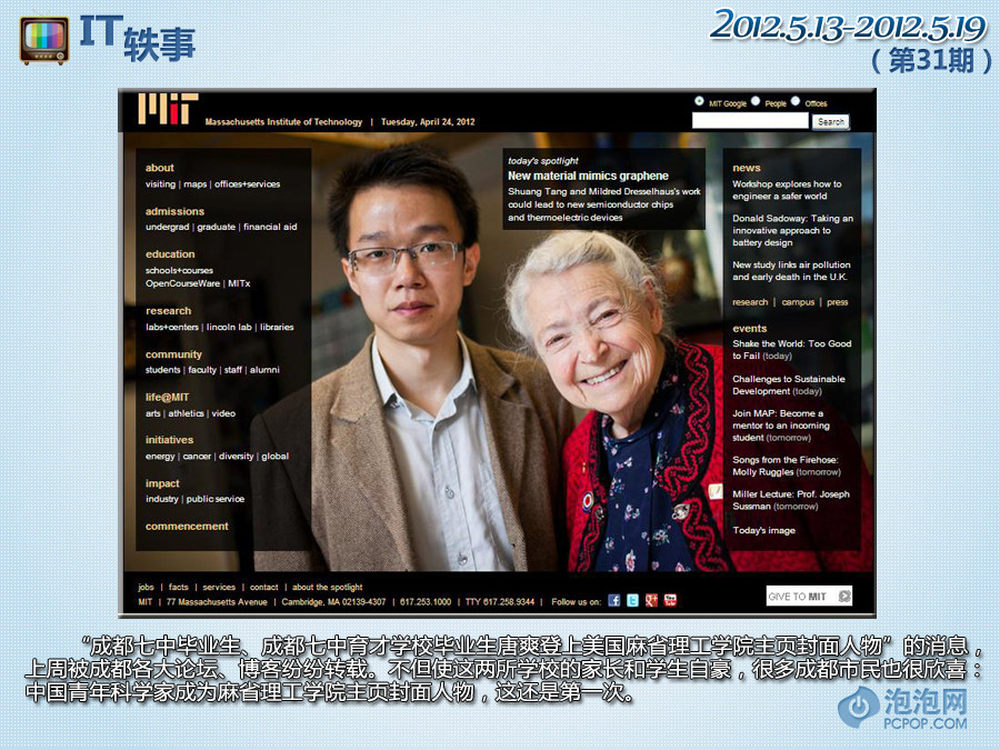 成都七中毕业生、成都七中育才学校毕业生唐爽登上美国麻省理工学院主页封面人物”的消息,上周被成都各大论坛、博客纷纷转载。不但使这两所学校的家长和学生自豪,很多成都市民也很欣喜:中国青年科学家成为麻省理工学院主页封面人物,这还是第一次。7/13