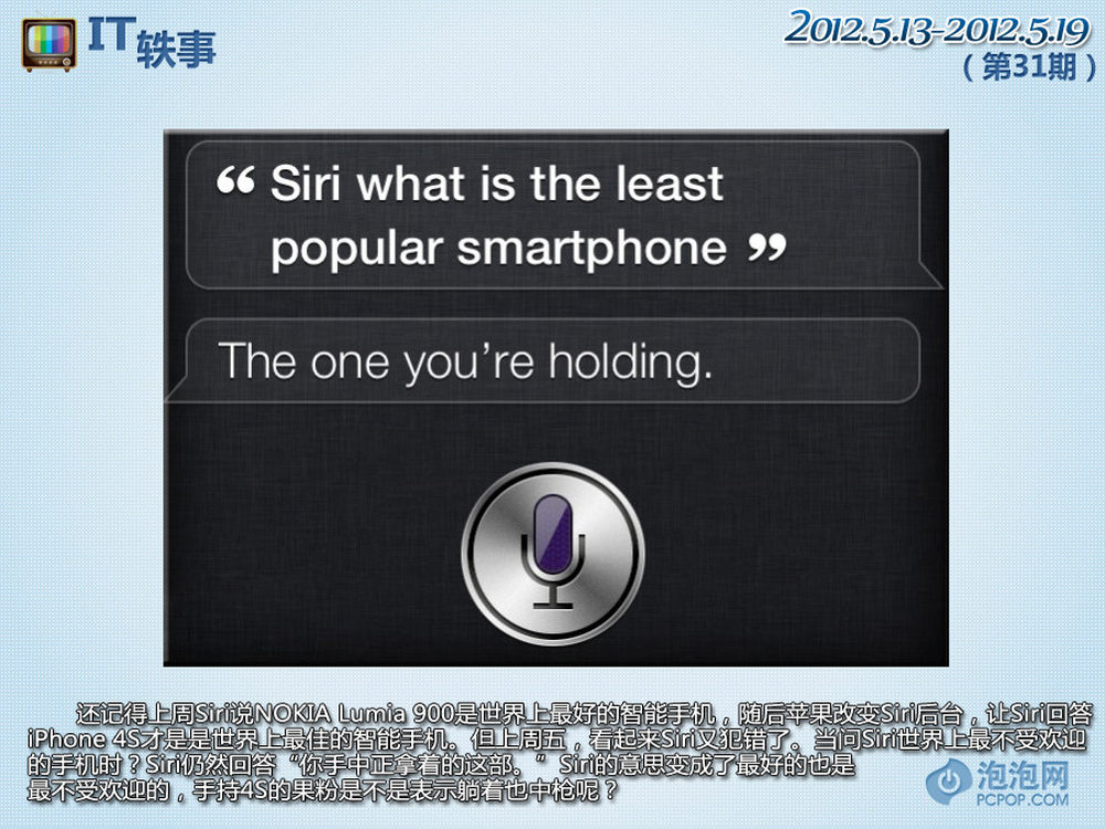 还记得上周Siri说NOKIA Lumia 900是世界上最好的智能手机,随后苹果改变Siri后台,让Siri回答iPhone 4S才是是世界上最佳的智能手机。但上周五,看起来Siri又犯错了。当问Siri世界上最不受欢迎的手机时?Siri仍然回答“你手中正拿着的这部。”Siri的意思变成了最好的也是最不受欢迎的,手持4S的果粉是不是表示躺着也中枪呢?8/13
