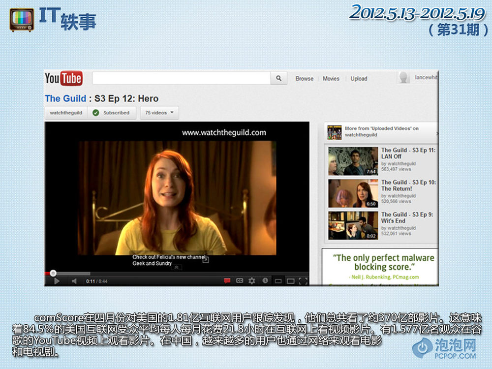 omScore在四月份对美国的1.81亿互联网用户跟踪发现,他们总共看了约370亿部影片。这意味着84.5%的美国互联网受众平均每人每月花费21.8小时在互联网上看视频影片。有1.577亿名观众在谷歌的YouTube视频上观看影片。在中国,越来越多的用户也通过网络来观看电影和电视剧。9/13