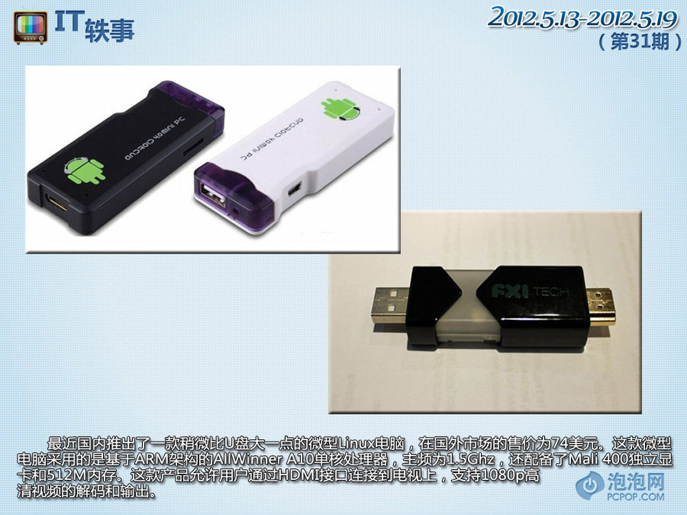 最近国内推出了一款稍微比U盘大一点的微型Linux电脑,在国外市场的售价为74美元。这款微型电脑采用的是基于ARM架构的AllWinner A10单核处理器,主频为1.5Ghz,还配备了Mali 400独立显卡和512M内存。这款产品允许用户通过HDMI接口连接到电视上,支持1080p高清视频的解码和输出。10/13