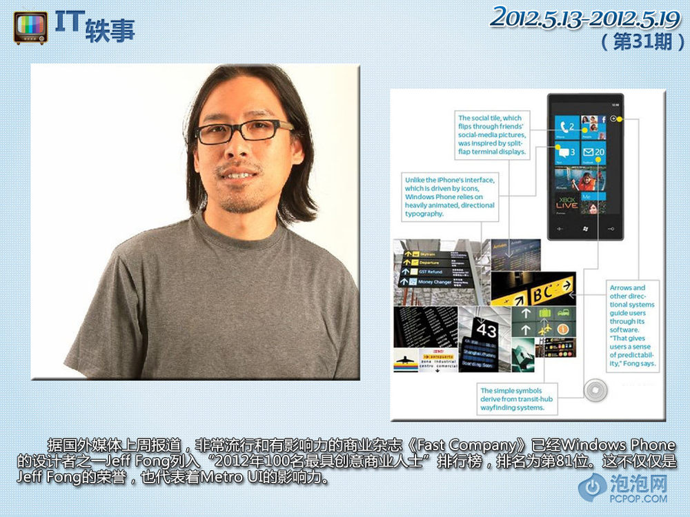 据国外媒体上周报道,非常流行和有影响力的商业杂志《Fast Company》已经Windows Phone的设计者之一Jeff Fong列入“2012年100名最具创意商业人士”排行榜,排名为第81位。这不仅仅是Jeff Fong的荣誉,也代表着Metro UI的影响力。11/13