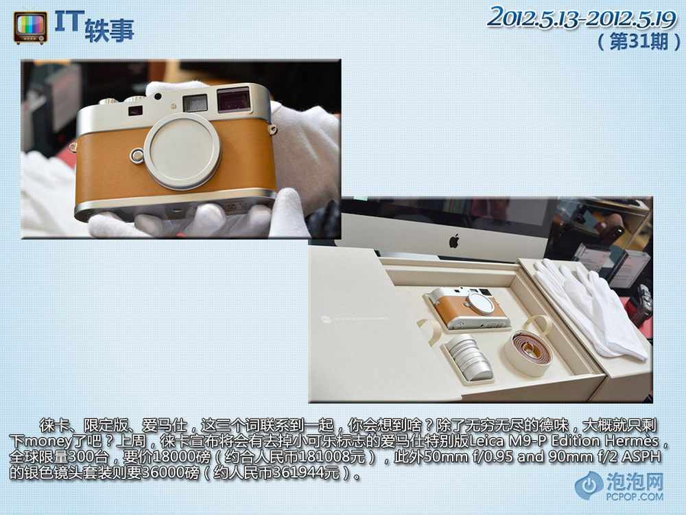 徕卡、限定版、爱马仕,这三个词联系到一起,你会想到啥?除了无穷无尽的德味,大概就只剩下money了吧?上周,徕卡宣布将会有去掉小可乐标志的爱马仕特别版Leica M9-P Edition Herm?s,全球限量300台,要价18000磅(约合人民币181008元),此外50mm f/0.95 and 90mm f/2 ASPH的银色镜头套装则要36000磅(约人民币361944元)。12/13