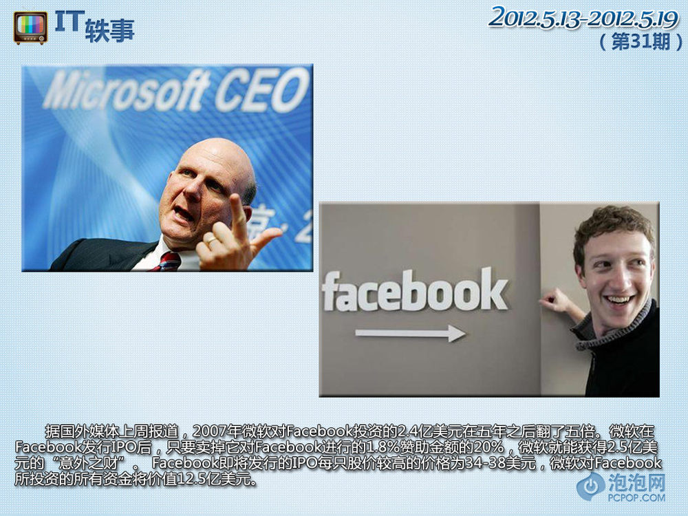 据国外媒体上周报道,2007年微软对Facebook投资的2.4亿美元在五年之后翻了五倍。微软在Facebook发行IPO后,只要卖掉它对Facebook进行的1.8%%赞助金额的20%%,微软就能获得2.5亿美元的“意外之财”。 Facebook即将发行的IPO每只股价较高的价格为34-38美元,微软对Facebook所投资的所有资金将价值12.5亿美元。13/13