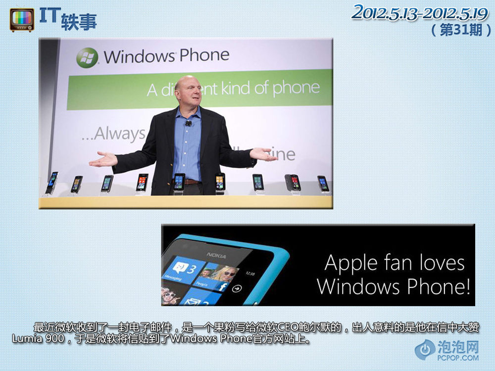 最近微软收到了一封电子邮件,是一个果粉写给微软CEO鲍尔默的,出人意料的是他在信中大赞Lumia 900,于是微软将信贴到了Windows Phone官方网站上。以下是邮件内容: