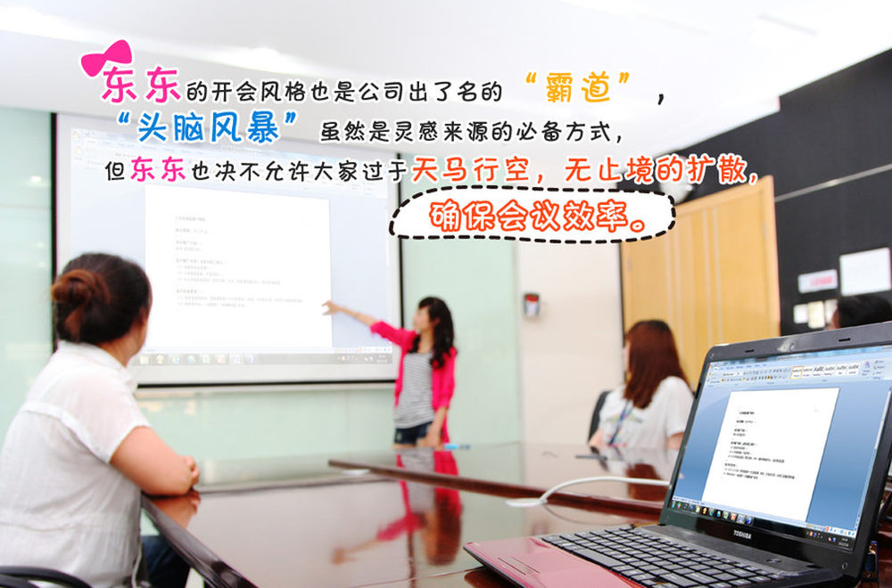 东东的开会风格也是公司出了名的“霸道”,“头脑风暴”虽然是灵感来源的必备方式,但东东也决不允许大家过于天马行空,无止境的扩散,确保会议效率。5/11