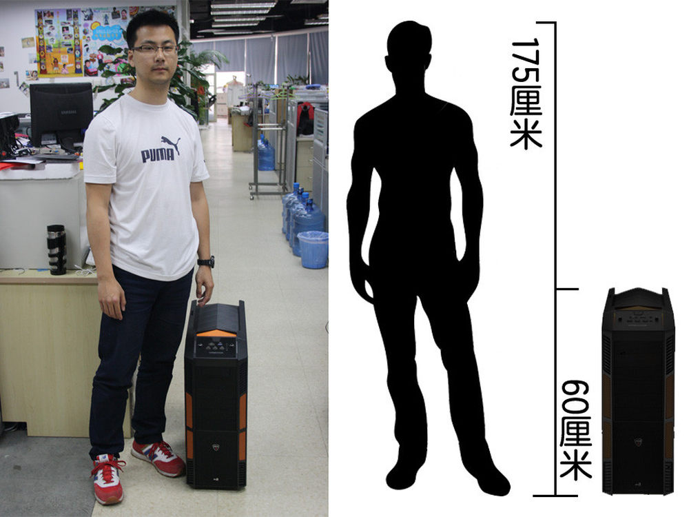 没有参照物,仅仅是把机箱摆在面板并不能体现出它的优势。小编请来了一位175厘米身高的编辑,可以看到机箱的高度大致为身高的1/3,实际上魔蝎600mm的高度确实符合这个比例。600mm,已经超越一般的全塔机箱了,因次可以猜测CPU散热器周围空间应该会有很大的余量,这对于安装8pin供电接口或是风扇等非常有利。5/12