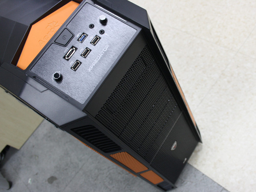 机箱面板顶部的操控台非常精致,拉丝效果的面板质感十足。接口方面,魔蝎提供了一个USB3.0、一个eSATA、三个USB2.0以及两个3.5mm音频接口。此外机箱还配置了两个风扇调速旋钮,各能控制三颗风扇,最高20W供电以及六颗风扇调速的能力完全可以满足高端玩家们的使用需求了。7/12