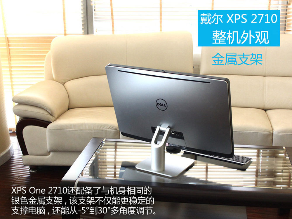 XPS One 2710还配备了与机身相同的银色金属支架,该支架不仅能更稳定的支撑电脑,还能从-5度到30度多角度调节6/18