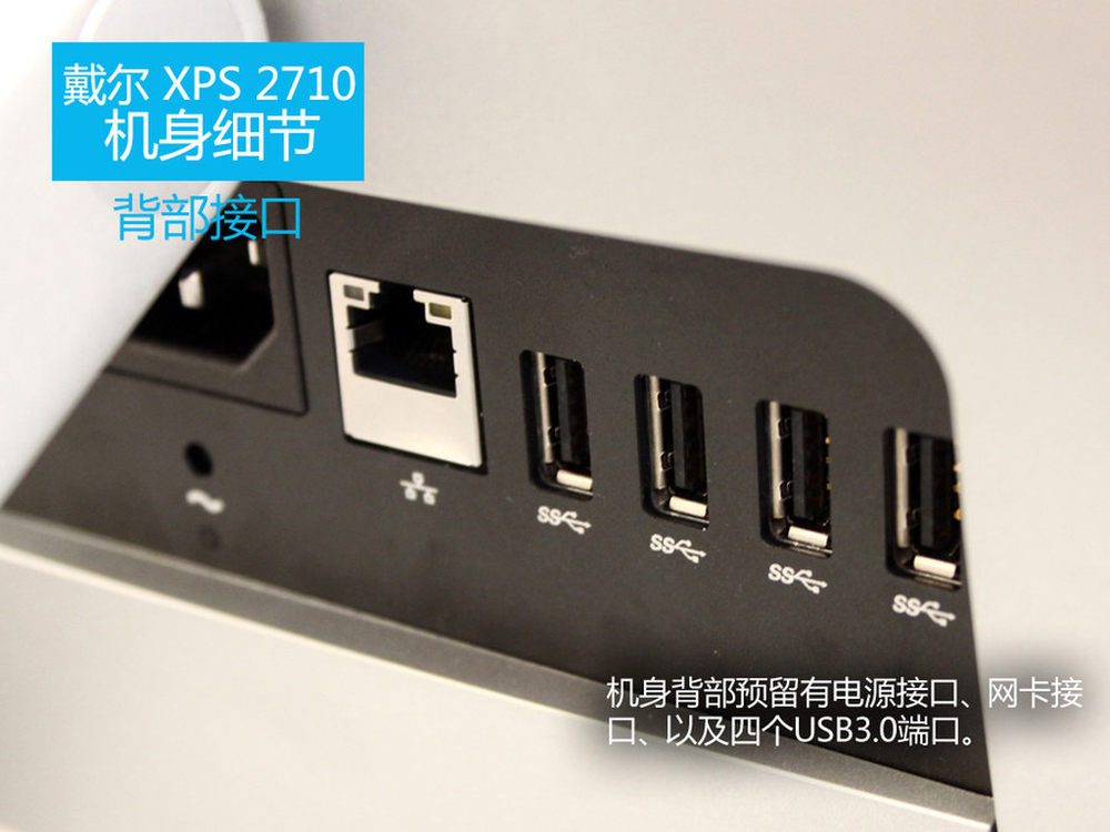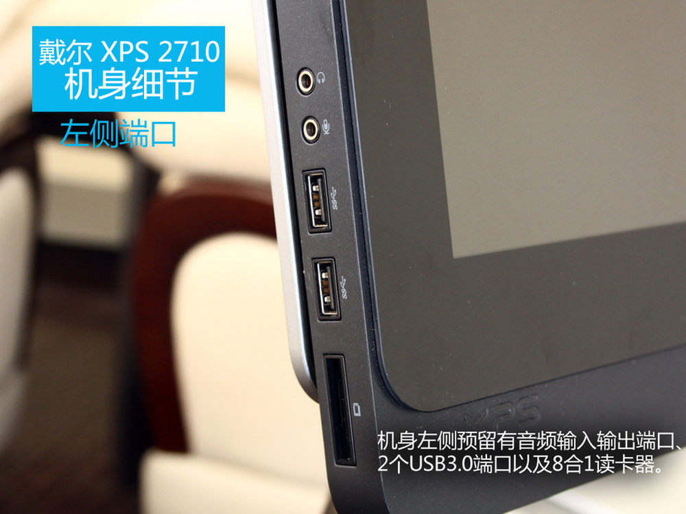 XPS One 2710在机身两侧端口设计上也相当人性化,均处于靠近底端位置,这样用户在插拔的时候更顺手。机身左侧预留有音频输入输出端口、2个USB3.0端口以及8合1读卡器。10/18