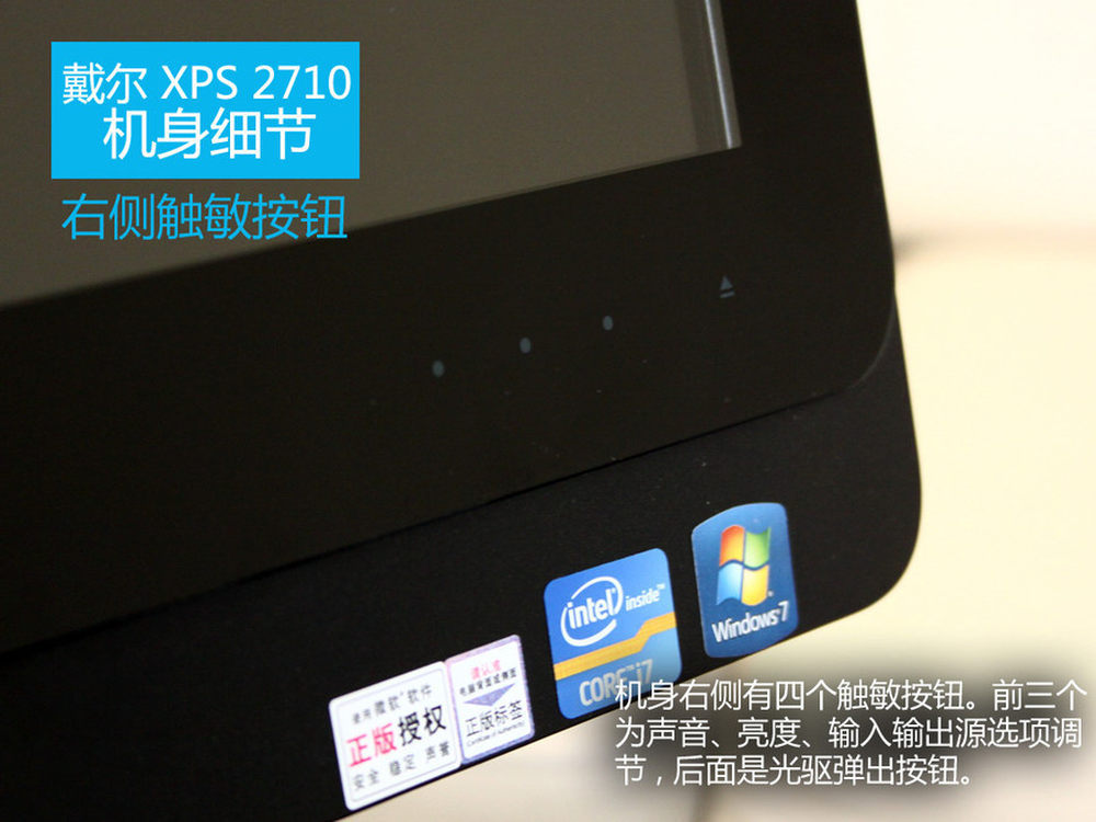 机身右侧有四个触敏按钮。前三个为声音、亮度、输入输出源选项调节,后面是光驱弹出按钮。以及机器内部软硬件正版认证标识。
