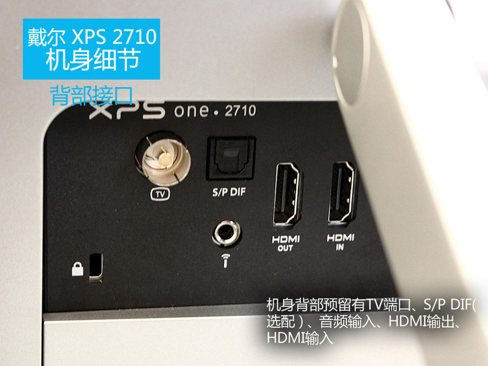机身背部预留有TV端口、S/P DIF(选配)、音频输入、HDMI输出、HDMI输入;以及最左侧的锁孔。