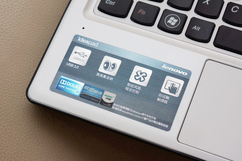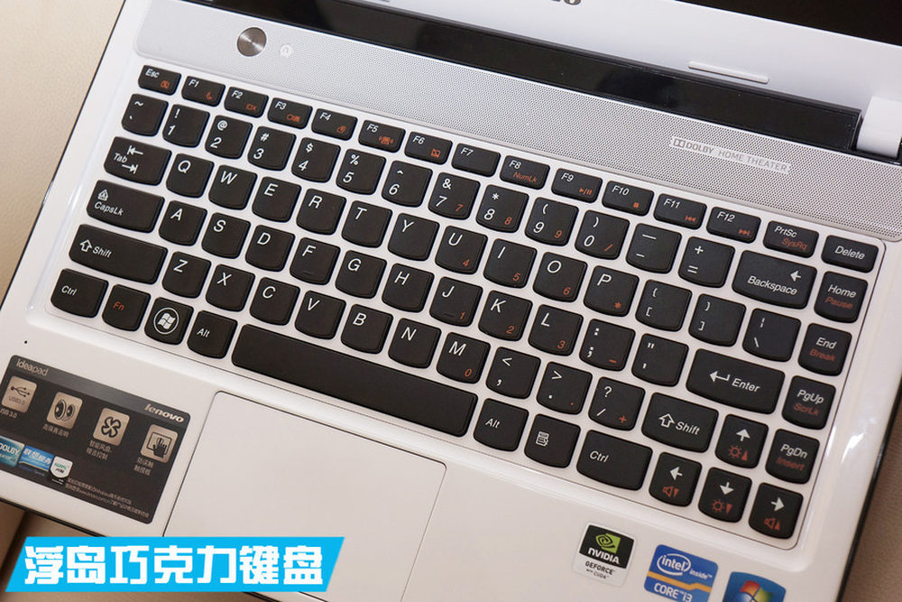 联想Z380键盘左下角是这款机器的一些特色设计介绍。14/20