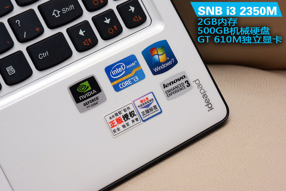 联想Z380主要硬件配置为:主频2.3GHz的SNB i3 2350M处理器,2GB DDR3 1333内存,500GB 7200转机械硬盘,NVIDIA GT 610M独立显卡和Intel HD 3000核芯显卡。15/20
