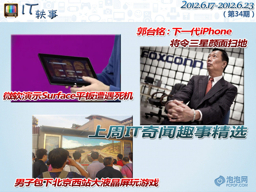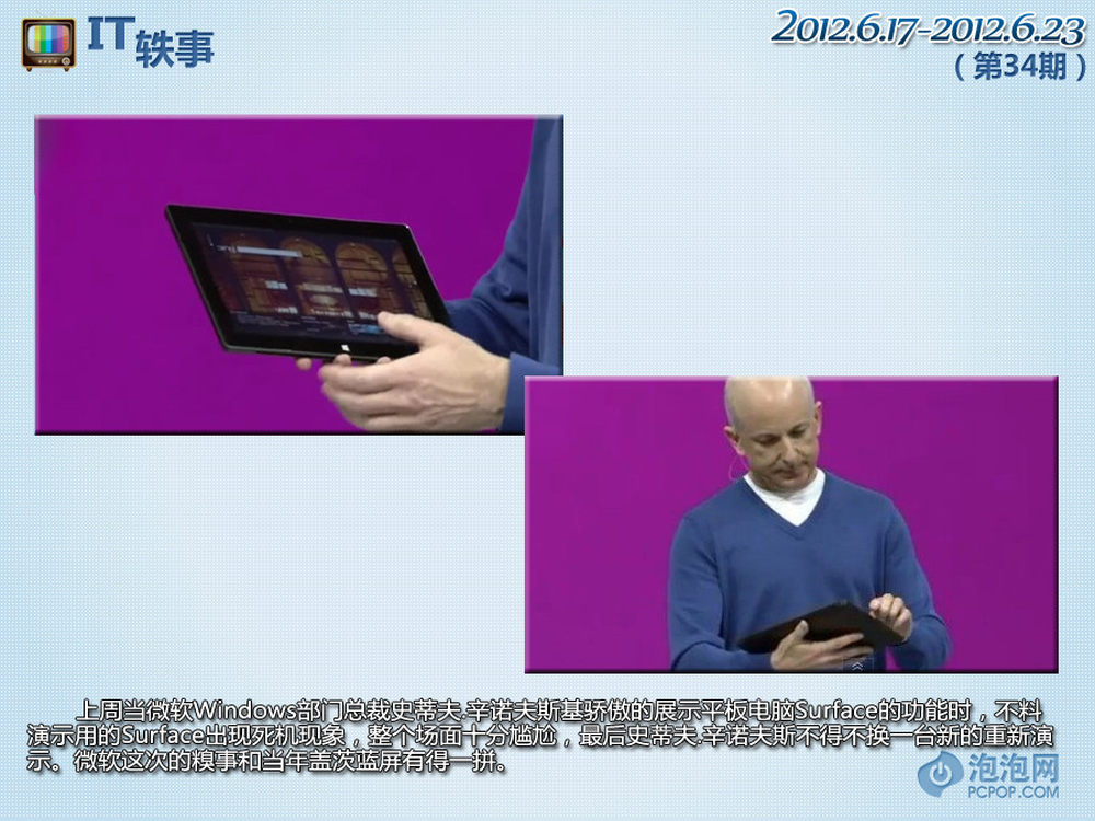 最新一期的IT轶事又和大家见面了,上周的IT圈子发生了不少奇闻趣事:上周当微软Windows部门总裁史蒂夫?辛诺夫斯基骄傲的展示平板电脑Surface的功能时,不料演示用的Surface出现死机现象,整个场面十分尴尬,最后史蒂夫?辛诺夫斯不得不换一台新的重新演示。更多IT轶事轻请看下文。2/11