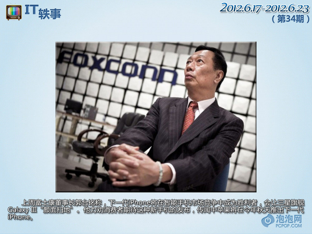 上周富士康董事长郭台铭称,下一代iPhone将在智能手机市场竞争中成为胜利者,会让三星旗舰Galaxy III“颜面扫地”。他力劝消费者期待这种新手机的发布,传闻中苹果将在今年秋天推出下一代iPhone。5/11
