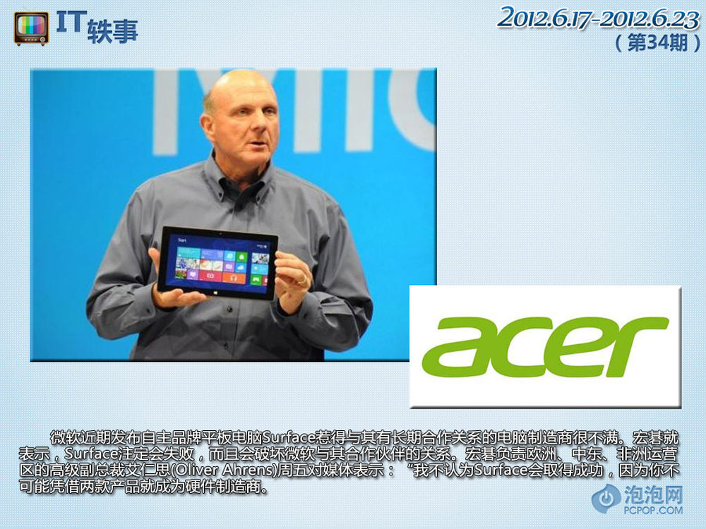 微软近期发布自主品牌平板电脑Surface惹得与其有长期合作关系的电脑制造商很不满。宏碁就表示,Surface注定会失败,而且会破坏微软与其合作伙伴的关系。宏碁负责欧洲、中东、非洲运营区的高级副总裁艾仁思(Oliver Ahrens)周五对媒体表示:“我不认为Surface会取得成功,因为你不可能凭借两款产品就成为硬件制造商。8/11