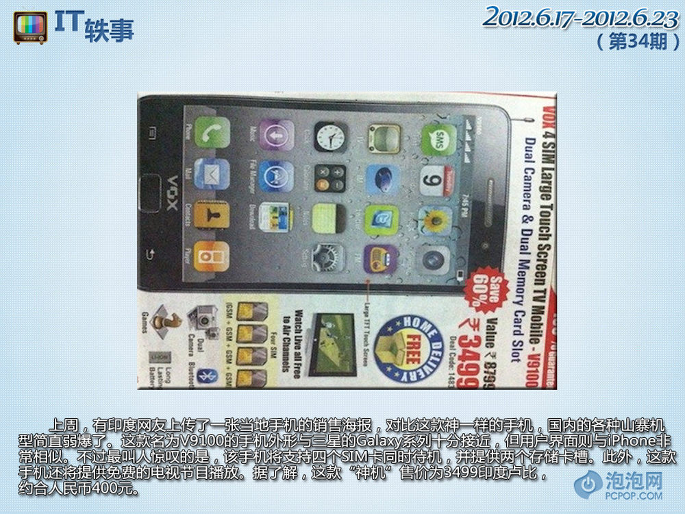 日前,有印度网友上传了一张当地手机的销售海报,对比这款神一样的手机,国内的各种山寨机型简直弱爆了。这款名为V9100的手机外形与三星的Galaxy系列十分接近,但用户界面则与iPhone非常相似。不过最叫人惊叹的是,该手机将支持四个SIM卡同时待机,并提供两个存储卡槽。9/11
