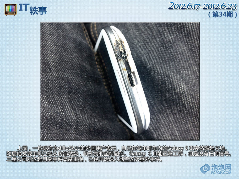 上周,一位昵称为dillo2k10的外国用户表示,自己在驾车时车内的Galaxy S III突然燃起火焰。随后他发现手机已经从内部燃烧,将外壳的塑料融化。Galaxy S III能正常工作,但是没有任何信号。三星公司对这起自燃事件高度重视,已经开始深入彻查这次意外事件。10/11