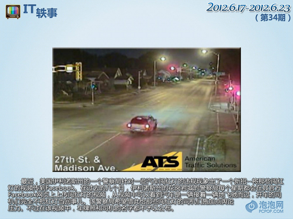最近,美国伊利诺斯州的一个警察局针对一些汽车闯红灯的违规现象出了一个新招--将那些闯红灯的视频传到Facebook。在过去的几个月,伊利诺斯州的花岗岩城的警察局每个星期都会在其官方Facebook网页上上传闯红灯的视频,从视频中可以看到汽车是一辆接着一辆地飞驰而过,开车的司机们完全不把红灯当回事儿。该警察局希望借此给那些闯红灯的司机们施加点舆论压力。不过在该视频中,车牌照和司机的名字都不予以公布。11/11