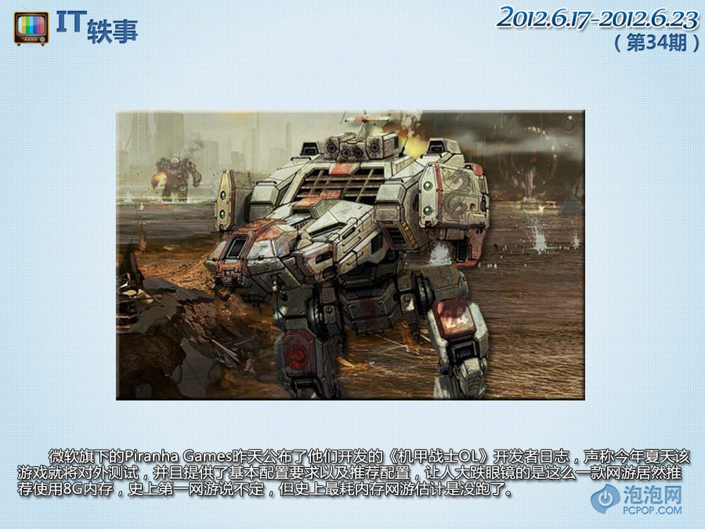 微软旗下的Piranha Games昨天公布了他们开发的《机甲战士OL》开发者日志,声称今年夏天该游戏就将对外测试,并且提供了基本配置要求以及推荐配置,让人大跌眼镜的是这么一款网游居然推荐使用8G内存,史上第一网游说不定,但史上最耗内存网游估计是没跑了。
