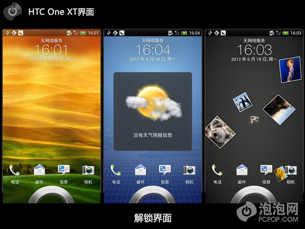 HTC One XT拥有多种锁屏风格,图片中展示的分别是标准、天气、照片三种,除此之外手机还内置有股票、社交等风格。13/16