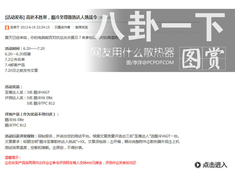 烈日炎炎,老牌散热器大厂酷冷至尊不仅为我们带来了两款高端CPU散热器新品,他还让各位有了免费体验新品的机会。截止到本月底,各位在酷冷至尊散热达人挑战令主题活动页面列出自己的平台即可有机会参与到X6 Elite以及均热板散热器TPC 812的评测试用,当然如果各位有幸被选用,发布评测文章后这两款售价分别为399和599的高端散热器就能免费送给各位了。如果发布的评测文章质量较优,且被评选为至尊达人,酷冷至尊还会在此基础上赠送大家V6GT一个。