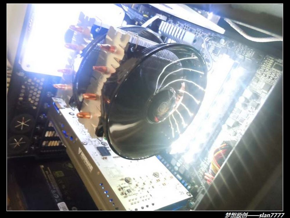 拉近镜头能够看到slan7777的特色平台,宇瞻雪豹、影驰GTX550Ti名人堂都是业界少有的白色PCB板硬件,配合了安耐美的白蝠之后机箱内的众多白色LED会让它们科技感十足。而且机箱方面,slan7777使用了明基最新上市的X300,大侧透会让LED的亮度发挥到极致。12/13