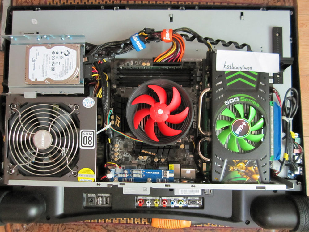 网友没枕头不睡觉的平台最为另类,目前他使用的是(貌似是自己DIY的)一体机,挂在显示器后确实非常节省桌面空间,不过不知道背了这么多硬件会不会让显示器支架得颈椎炎。