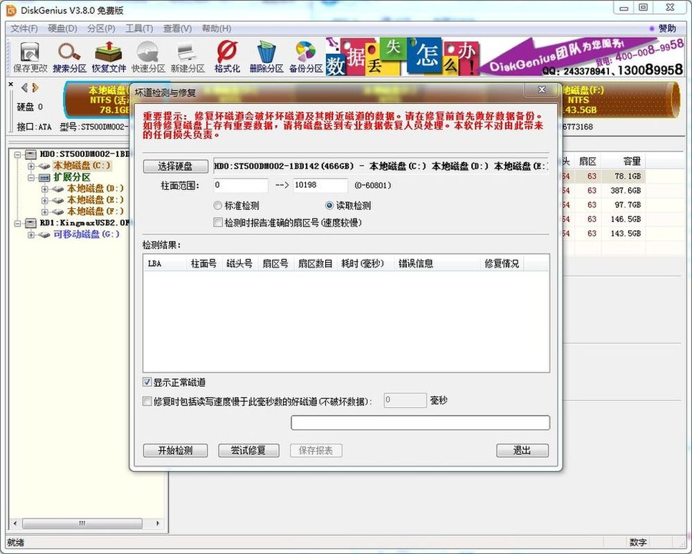不过大家需要注意的是,硬盘修复并不是很轻易的事情,在其上方红字著名了“重要提示”:请在修复前做好数据备份,之所以这样提示,是因为很有可能软件进行坏道恢复失败,导致磁盘中的数据真正丢失,给大家带来不必要的损失,所以在这里笔者还是更建议大家去正规的硬盘修复商家处理,自己进行硬盘修复还是有一定的危险性的。12/16