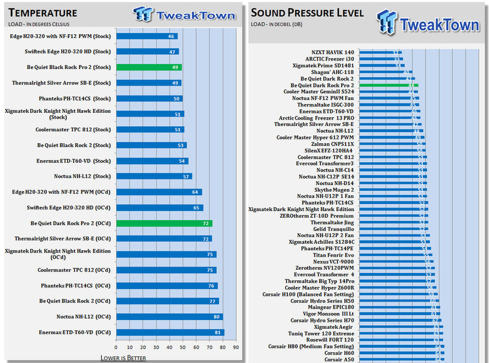 tweaktown使用i7 2600K进行温度测试,测试包含默认频率和4.5GHz时的两组情景,从满载测试结果来看Dark Rock Pro 2成绩仅仅次于两款高端水冷,表现与利民的旗舰散热器银箭SB-E持平。