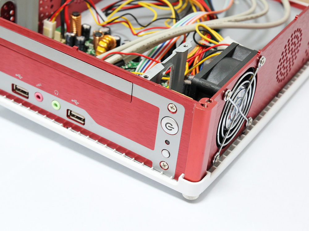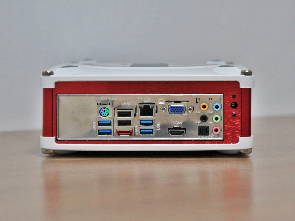机箱正面采用了红白相间的设计,看起来非常醒目大气,IO接口也都完整保留,包括2个USB 2.0接口和音频接口。