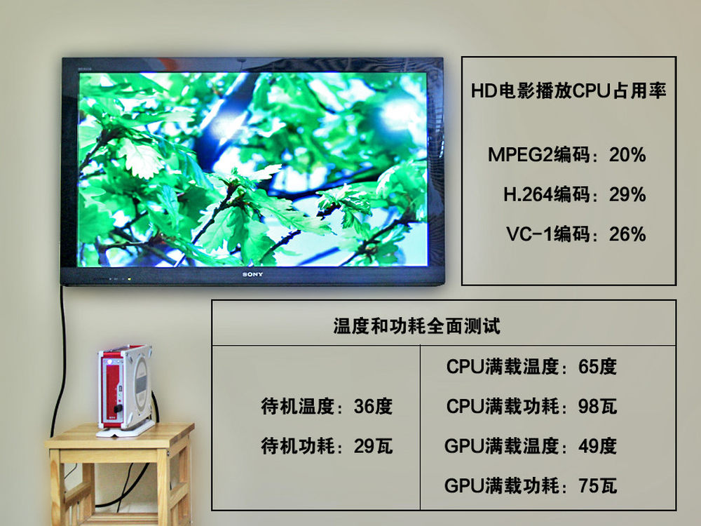 高清播放中选用了时下流行的三大视频编码方式电影(均为蓝光原盘高码率电影):MPEG2、H.264和VC-1,实测CPU占用率分别为20%%、29%%、26%%。