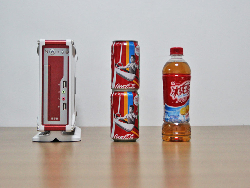 在机箱附件中我们意外的发现了竖立支架,安装之后,占地面积大幅缩减,仅仅只有两个可口可乐罐的高度,完全可以立在电视旁边。17/24