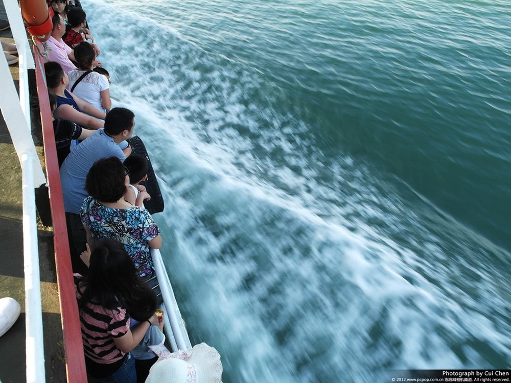 我乘坐的这艘大船分为上下两层,从上面向下望去,船舷与海水拍打出的浪花层层叠叠,在尼康S9200黑白滤镜下更为突出。28/35