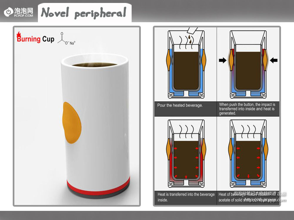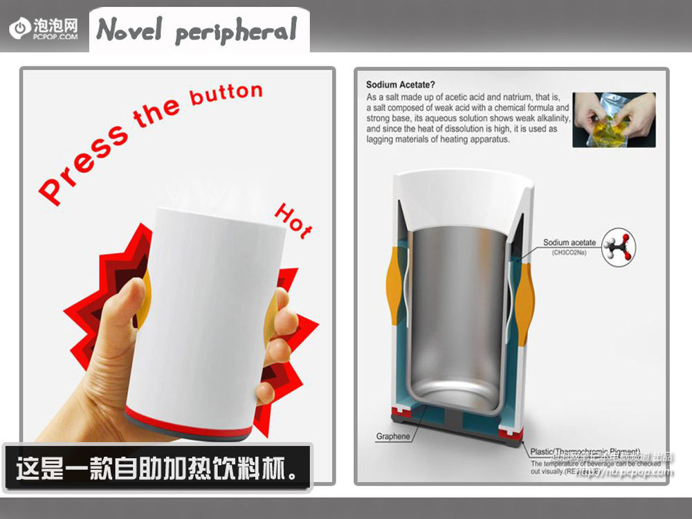 即便在炎热的夏季还是有人喜欢各种热饮,而如何做到长时间保温却有些困难,设计师利用醋酸钠的化学特性,设计了这款自助加热杯。(图片来源于:专利之家)3/14