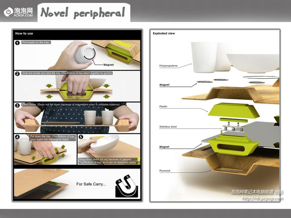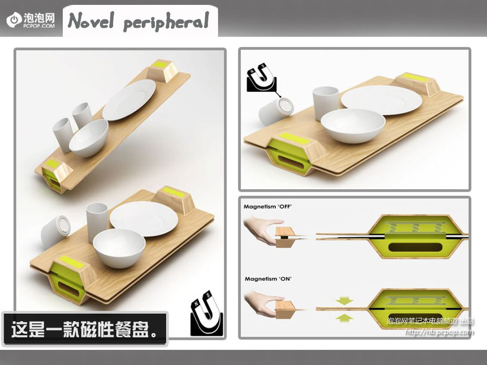 端起它时,餐盘上的碗和杯盘受到磁力作用,会吸稳稳附在餐盘上。而当放下餐盘时,内部的弹簧机关解除,餐具又可以自由拿取了。(图片来源于:专利之家)9/14