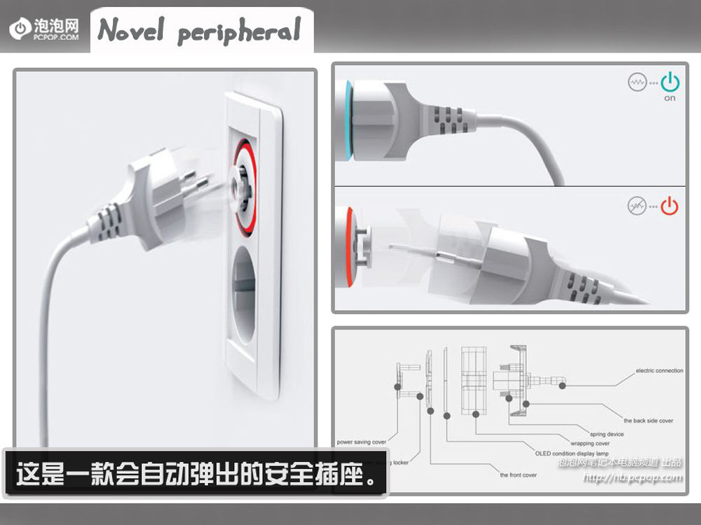 在使用完电器后,很多人都习惯于只关闭电器电源,而忘记拔出插头,这样做不仅消耗更多电能,也存在一定的安全隐患。针对这一现象,设计师们提出了弹出式插座的方案。当关闭电器电源而没有拔出插头时,插座就会亮起红灯,并在十分钟后自动将插头弹出,从而彻底断开电源。也正是由于它的创新性与实用性,该设计被评为2011年红点设计概念大奖的获奖作品之一。(图片来源于:专利之家)10/14