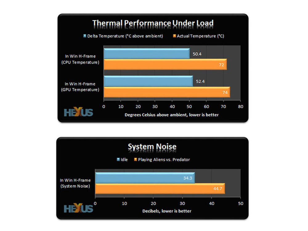 经过测试,CPU的温度4.4G的压力下的温度为72℃,GPU温度为74摄氏度。两大核心的周边温度都在50℃以上。另外满载时的噪音为44.7dBA,空闲时噪音为34.3dBA。