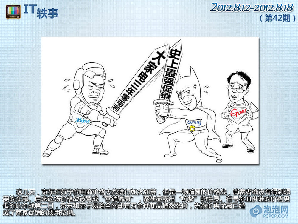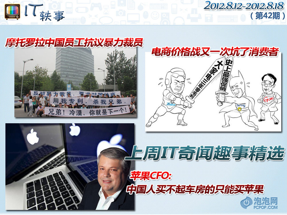 新一期的IT轶事又在周末和大家见面了,上周的IT圈子可谓风生水起:苹果CFO认为在中国很多买不起房子和轿车的消费者想要拥有或者向其他人展示自己的产品,而苹果的产品是他们的最佳选择;京东和苏宁的电商价格战成为了这些天的最热事件,不过消费者最后发现所谓的价格战只是一场营销宣传,被坑的依然是消费者!本期更多IT奇闻轶事请看文章详细内容。2/12