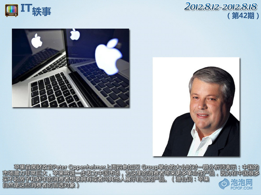 苹果首席财政官Peter Oppenheimer上周四参加ISI Group举办的大会时对一群分析师表示:中国的市场潜力非常巨大,苹果将进一步发力中国市场,为这里的消费者带来更多革命性产品,因为在中国很多买不起房子和轿车的消费者想要拥有或者向其他人展示自己的产品。(潜台词:苹果自然是这些消费者的首选对象)3/12
