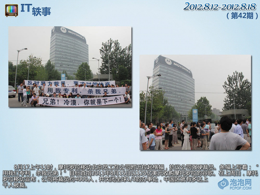 8月17上午11时,摩托罗拉移动北京员工在公司附近拉起横幅,抗议公司强硬裁员。条幅上写着:“用我们专利,杀我兄弟!”目标直指2011年8月15日以125亿美元收购摩托罗拉的谷歌。在上周日,摩托罗拉移动宣布,公司将裁员约4000人,并关闭全球1/3的办事处,中国区就有多达上千人被裁。4/12
