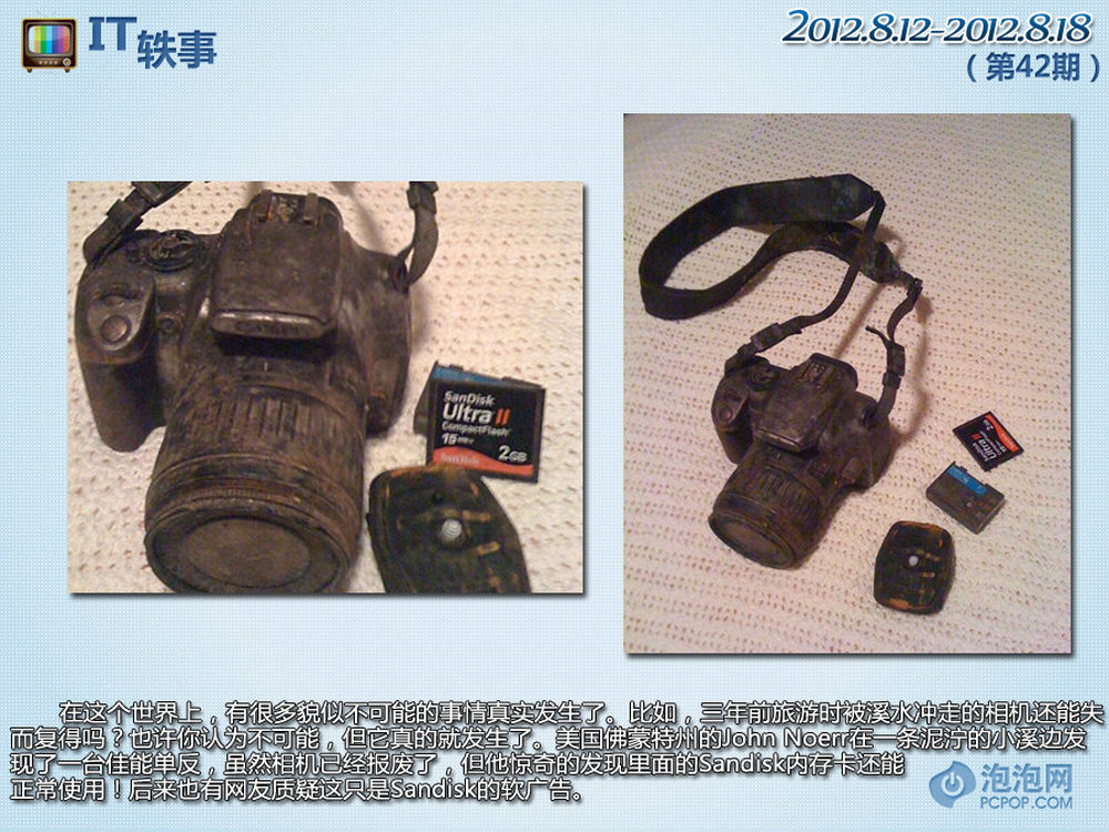 现了一台佳能单反,虽然相机已经报废了,但他惊奇的发现里面的Sandisk内存卡还能正常使用!后来也有网友质疑这只是Sandisk的软广告。6/12