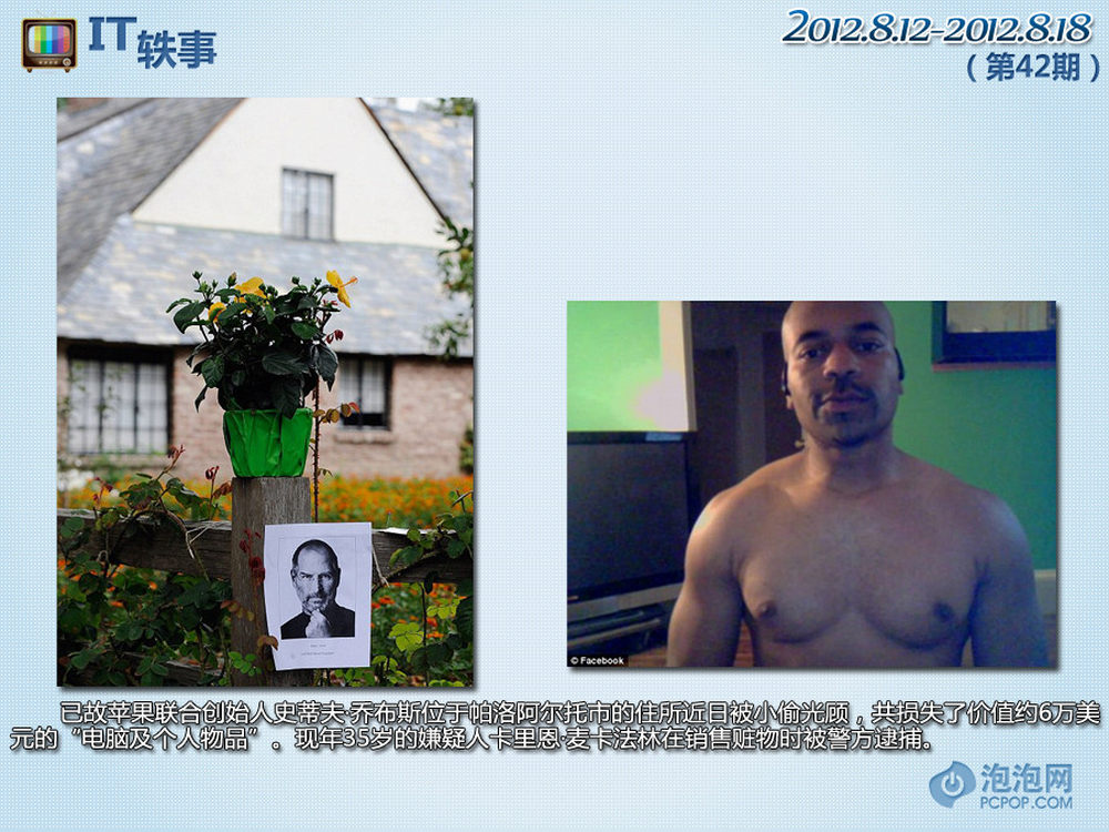 已故苹果联合创始人史蒂夫?乔布斯位于帕洛阿尔托市的住所近日被小偷光顾,共损失了价值约6万美元的“电脑及个人物品”。现年35岁的嫌疑人卡里恩?麦卡法林在销售赃物时被警方逮捕。7/12