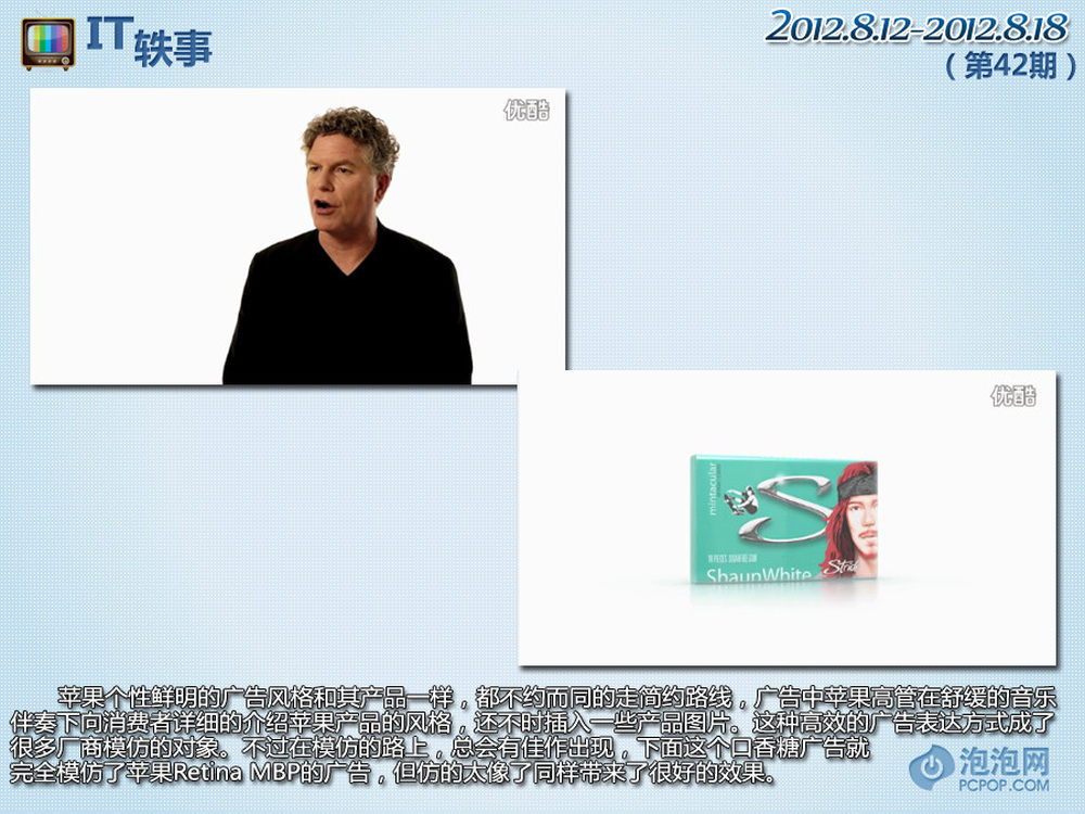 苹果个性鲜明的广告风格和其产品一样,都不约而同的走简约路线,广告中苹果高管在舒缓的音乐伴奏下向消费者详细的介绍苹果产品的风格,还不时插入一些产品图片。这种高效的广告表达方式成了很多厂商模仿的对象。不过在模仿的路上,总会有佳作出现,下面这个口香糖广告就完全模仿了苹果Retina MBP的广告,但仿的太像了同样带来了很好的效果。